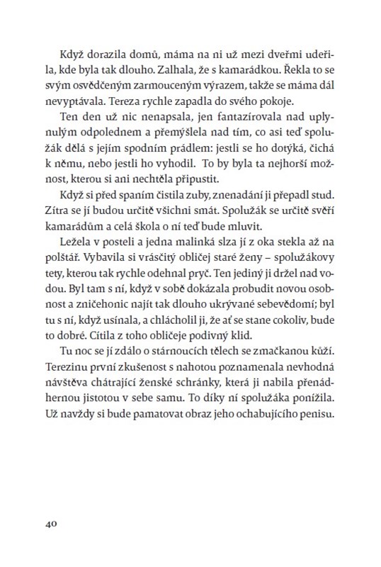 Tereza je mladá žena, studentka literatury a spisovatelka, která kolísá v mezilidských vztazích, partnerství, ohledává intimitu i vlastní sexualitu i tělesnou intimitu. Po nečekaném úspěchu svého debutového románu se vyrovnává se společenským tlakem i tíhou očekávání, která od ní všichni mají.