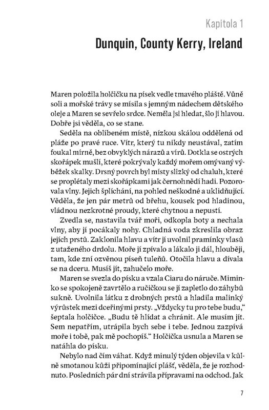 Klára vyrostla v Praze a neví, že její život začal na drsném západním pobřeží Irska. Netuší, že kdysi byla holčičkou Ciarou, kterou někdo odložil na práh dětského domova. Po smrti novorozeného syna, rozpadu manželství a zjištění, že si ji rodiče přivezli z pracovního pobytu v Irsku, se její svět roztříští na kousky. Odjíždí zapomenout a najít vlastní kořeny. Na útesech, plážích a v kronikách rozplétá osudy svých předků úzce spojené s historií nehostinného ostrova. Zjišťuje, že každá generace čelila jiným zkouškám, jiným ztrátám a jiným volbám. A že síla ženy se často rodí právě z bolesti, kterou se rozhodne unést.