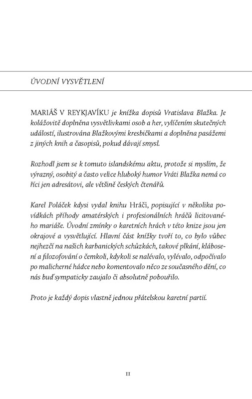 Vratislav Blažek (1925–1973) je známý především jako scenárista a dramatik. Mezi jeho nejznámější díla patří předlohy ke kultovním českým filmům Starci na chmelu či Dáma na kolejích; otextoval i řadu písní, které časem zlidověly, mimo jiné je autorem textu první české písně s „videoklipem“ Dáme si do bytu. Sám se stal předobrazem pro postavu Blažeje ze Škvoreckého románu Příběh inženýra lidských duší. Mariáš v Reykjavíku (1975) vydal v roce 1975 Josef Škvorecký v exilovém nakladatelství 68 Publishers. Z Blažkových dopisů z let 1968–1973 ji sestavil a předmluvou opatřil Václav Táborský, další významná postava české kinematografie. Současnému čtenáři se v ní nabízí svébytný pohled na jedno vzácné přátelství i do prostředí české emigrace. V roce 1975 za ni Blažek posmrtně získal Cenu Egona Hostovského. V České republice kniha vychází poprvé, a drží se původní úpravy, kterou jí dal grafik Mikuláš Kravjanský.