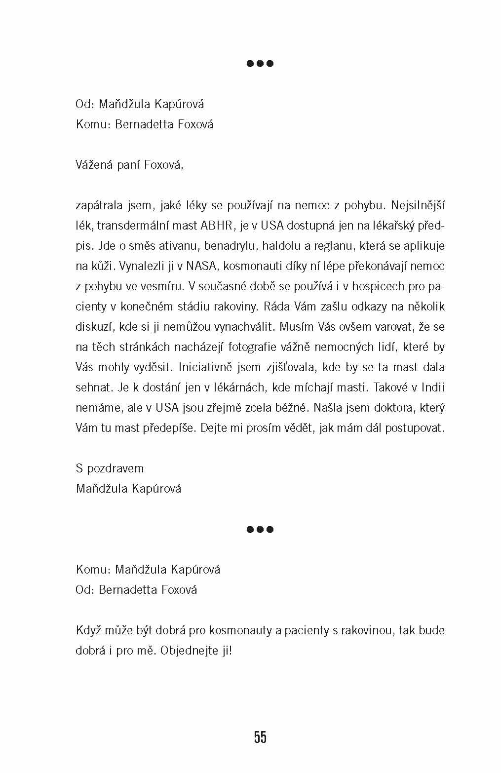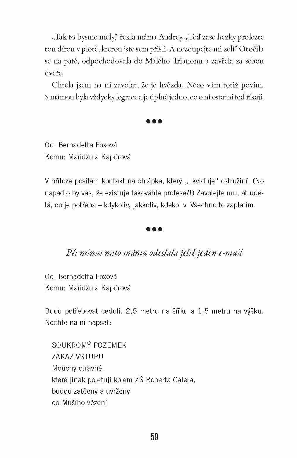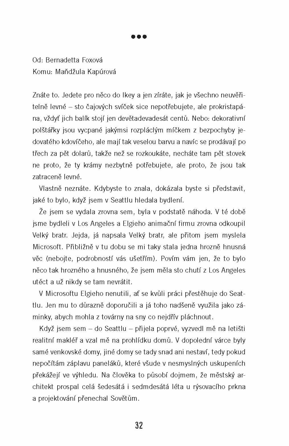 Geniální, nebo vyšinuté? Nezřízeně vtipná kniha o dívce, která na vlastní pěst pátrá, kam že se to poděla její matka a nebojí se použít všechny prostředky, včetně: veřejných listin, tajné korespondence FBI, emailů přátel, rodiny, učitelů a všeho co má po ruce.