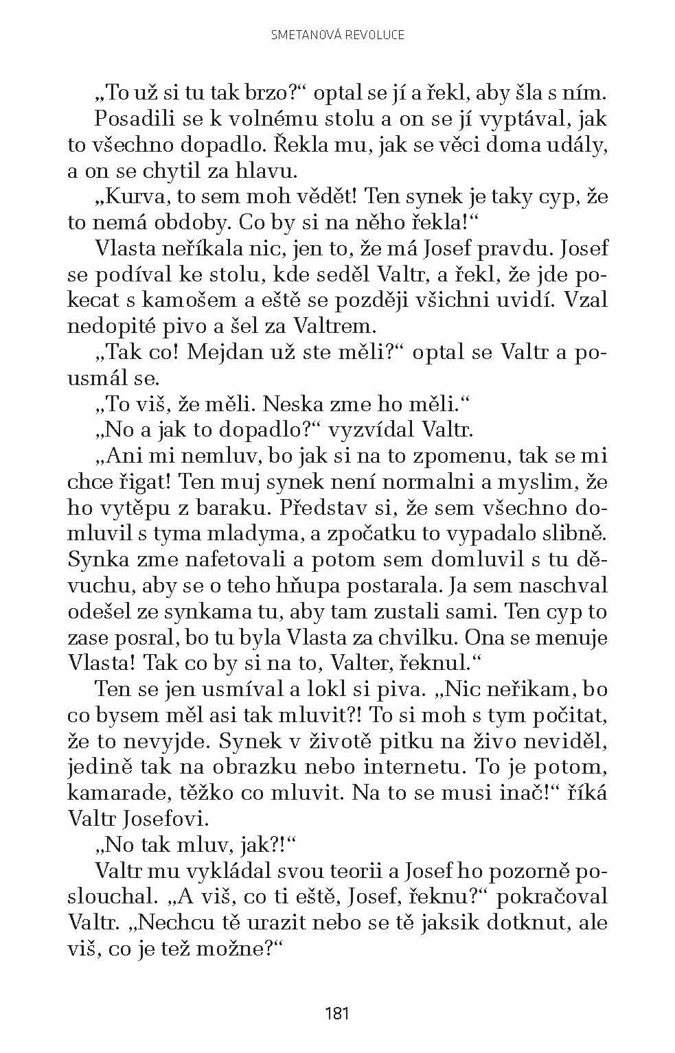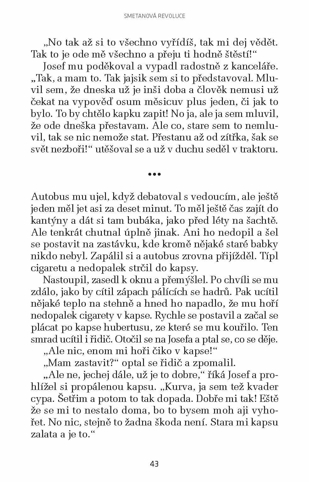 Smetanová revoluce je další román od Ivana Landsmanna, který k sobě před lety strhl pozorost svou prvotinou Pestré vrstvy. I ve Smetanové revoluci hraje hlavní roli jazyk, přesněji ostravský dialekt, jímž mluví hlavní hrdina. Bývalý horník Josef, který v nové době ztratil půdu pod nohama, s nevalným úspěchem se snaží podnikat, ale dravý porevoluční trh je na něj příliš. Zvláštní svéráz jeho mluvy a jeho bezprostřední, mnohdy i prostomyslný pohled na fungování světa a společnosti dodávají jeho příběhu tragikomický nádech. Promluvy, jež vede s kumpány po hospodách, kde plánují, co podniknou, jsou neodolatelnou směsí vulgarity a naivity.