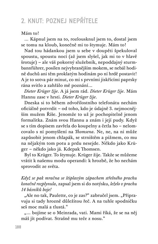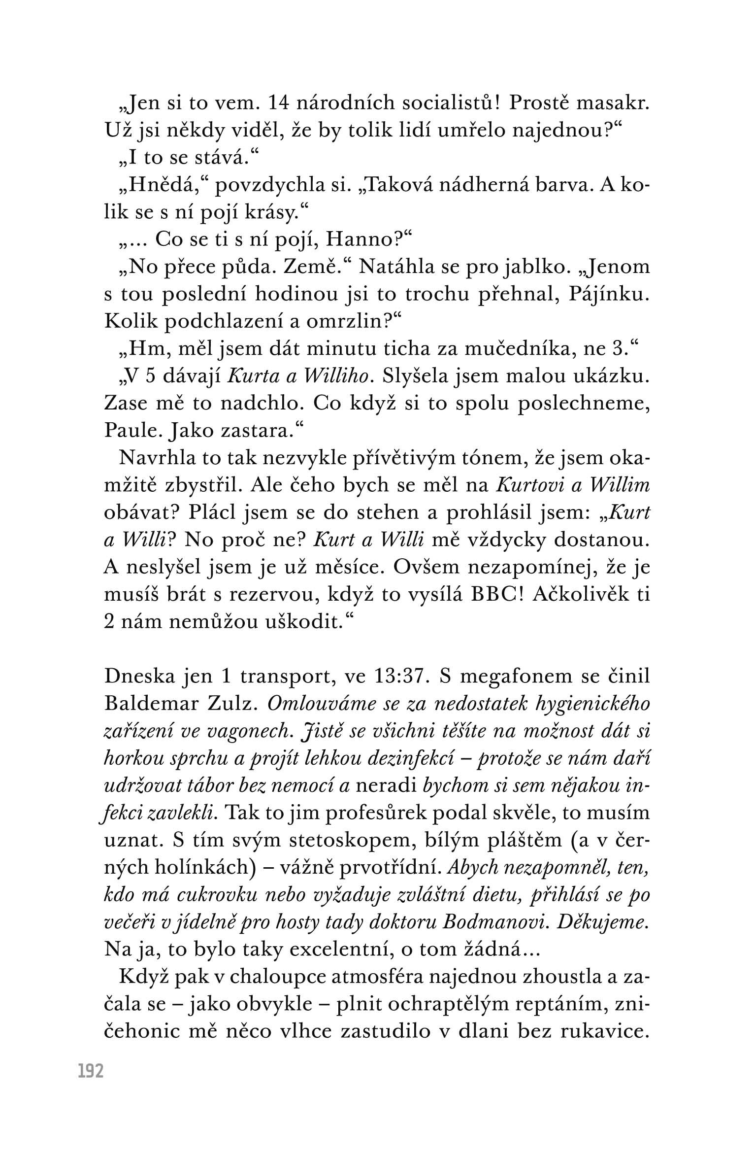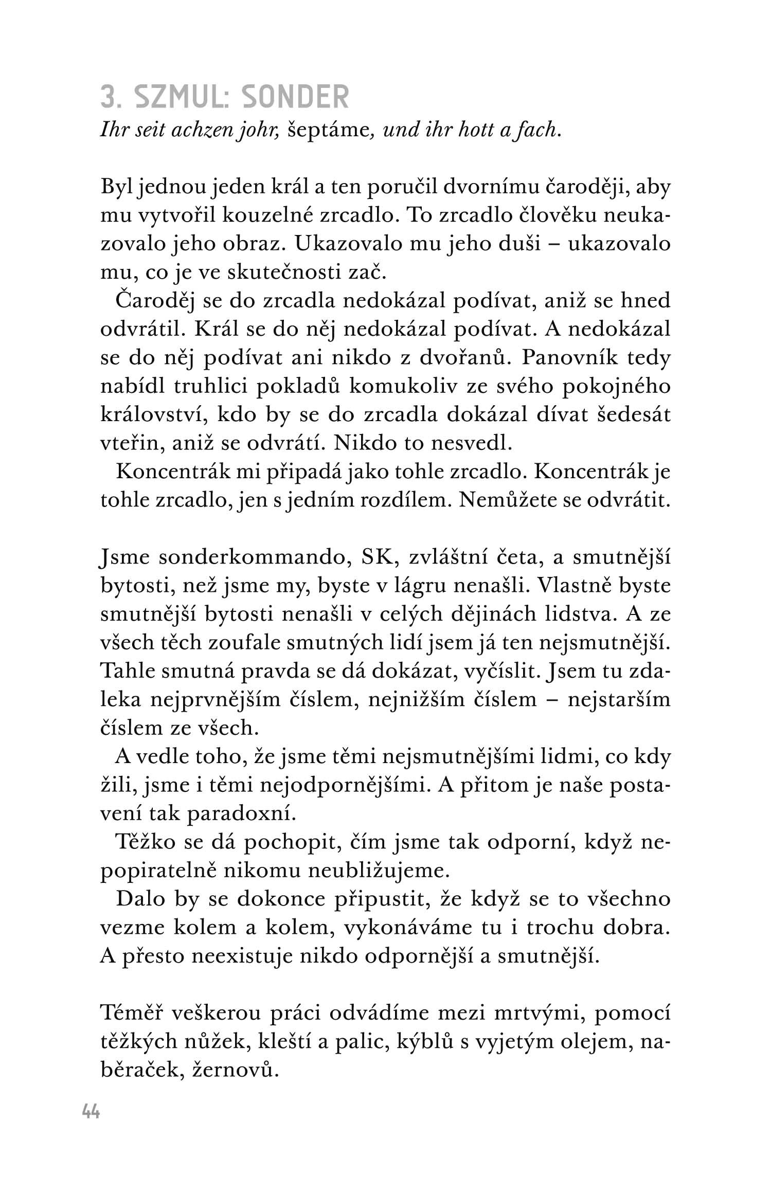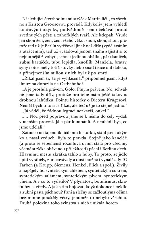 Martin Amis s příznačnou stylistickou bravurou rozehrává trojí part v podání toho, kdo dal soukolí Osvětimi do pohybu, toho, kdo v něm přišel i o možnost podívat se komukoliv do očí, a toho, kdo se ho pozdě, ale přece pokusí malinko rozklížit.
