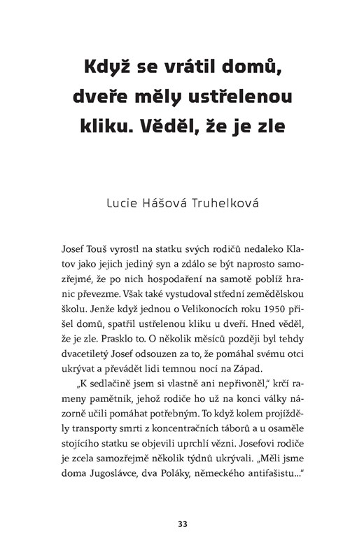 Knižní sbírka fascinujících případů obětí totalitní zvůle v Československu přináší pestrou mozaiku mapující všechno, co obyvatelé této země ve 20. století prožili: války, nacistickou a sovětskou okupaci, komunistické lágry, monstrprocesy, ale také vzepjetí proti totalitě. Pohnuté osudy, v kterých se zrcadlí jednotlivé éry našich dějin, jsou mnohdy napínavější než smyšlené thrillery. Zvláště jímavé jsou příběhy těch, kdo byli pronásledování jak totalitní mocí nacistickou, tak komunistickou… Jak řekla jedna z pamětnic:„Čím je člověk víc pod tlakem, tím se chová líp.“ Platí to pro vojáky z čs. posádky, jež se postavila v roce 1939 jako jediná Němcům, stejně jako pro prostého občana, který než by se upsal StB, raději volil život v šikaně.