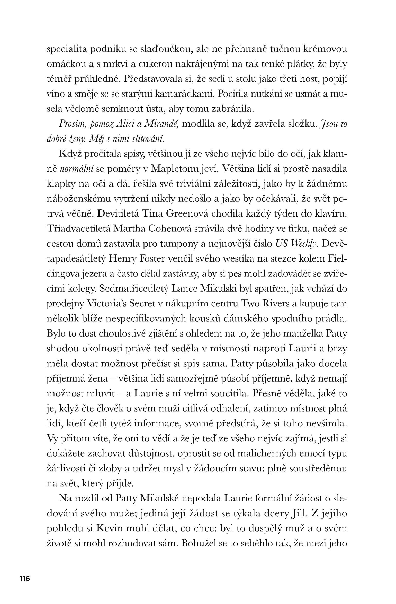 Ale co to znamená, když si Bůh (byl-li to on) vzal vedle křesťanů i muslimy, buddhisty, nebo dokonce alkoholiky a zvrhlíky? Na příběhu lidí z newyorského předměstí ukazuje, jaké důsledky může mít událost, jež popírá veškerou racionalitu; jaké extrémní a fanatické reakce vyvolává, jak nebezpečné démony v lidech probouzí. Zároveň se nevzdává naděje, že i uprostřed všeobecného šílenství se najdou lidé, kteří neztrácí hlavu a dokáží zabránit nejhoršímu, jímž je naprostá ztráta smyslu pro elementární lidskost.
