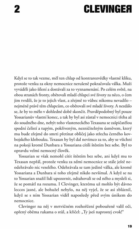 Ve své nejslavnější knize Joseph Heller (1923–1999) na základě vlastních zkušeností s armádou píše o světě, v němž je vše postavené na hlavu; a protože absurdita je věčná, zamotal tento skvělý protiválečný román hlavu už několika generacím čtenářů. Odehrává se za druhé světové války a v sérii absurdních epizod vyprávěných z hlediska několika různých postav satiricky napadá krutost a nesmyslnost válečné mašinerie. Hlavní postavou je poručík letectva Yossarian, který je se svou bombardovací letkou ze základny na ostrově Pianosa ve Středozemním moři nucen útočit na různá italská města, a stejně jako jeho druhové ve zbrani se snaží udržet si uprostřed válečného šílenství a navzdory absurdním příkazům svých nadřízených zdravý rozum a dostat se domů.