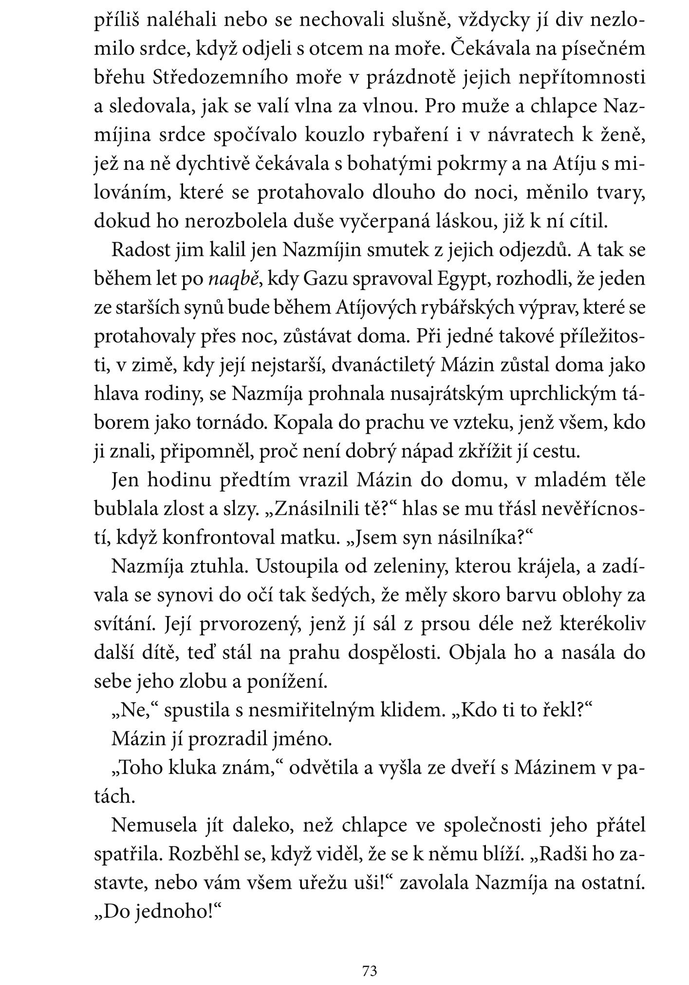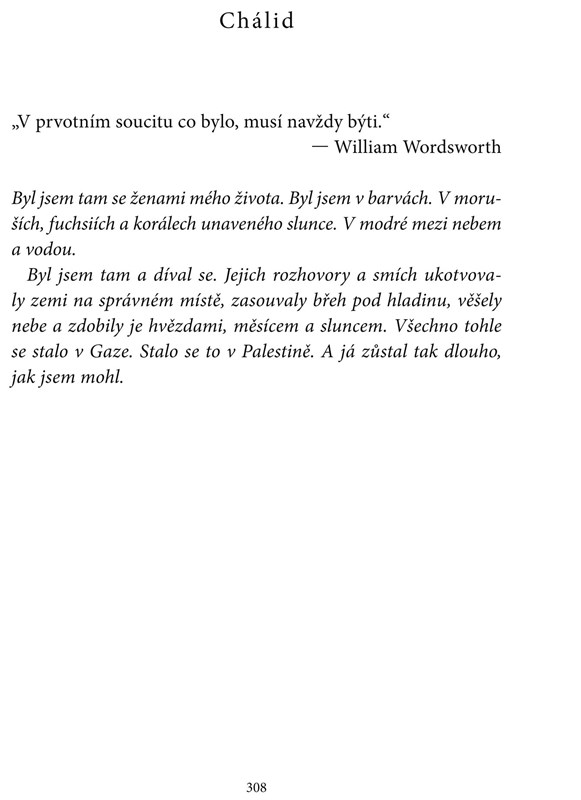 Byl jsem tam a díval se. Jejich rozhovory a smích ukotvovaly zemi na správném místě, zasouvaly břeh pod hladinu, věšely nebe a zdobily je hvězdami, měsícem a sluncem. Všechno tohle se stalo v Gaze. Stalo se to v Palestině. A já zůstal tak dlouho, jak jsem mohl.