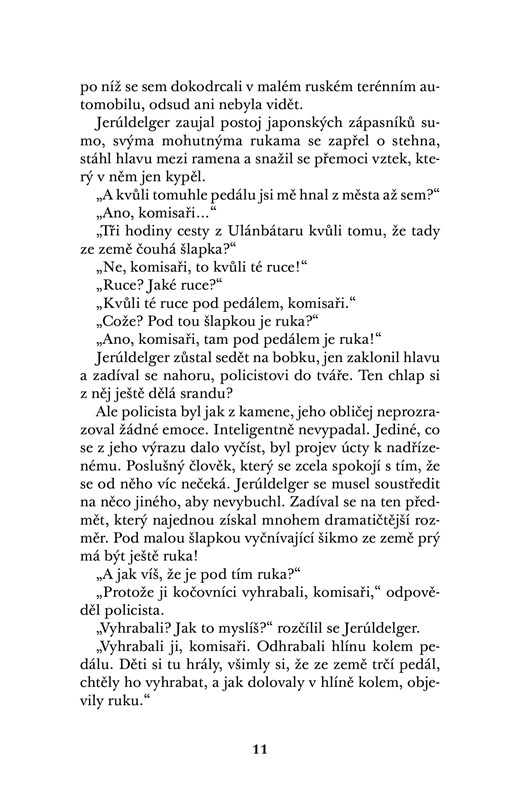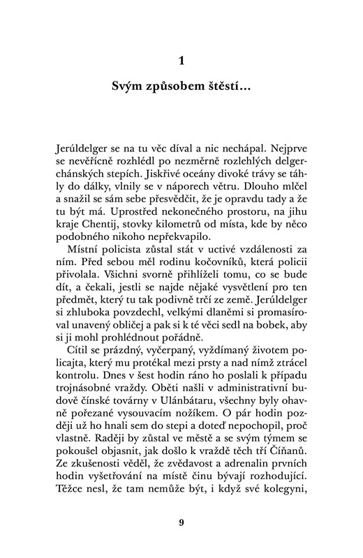 Komisař Jerúldelger, rázný muž s minulostí poznamenanou krutým osobním dramatem, jehož v dětství vychovali a vycvičili v klášteře mniši ovládající bojová umění, se ujímá dvou případů plných krutosti a násilí. Pátrání se odehrává v mongolských stepích, zejména však v hlavním městě Ulánbátaru. Autor nás při něm provádí krásnou a drsnou přírodou, připomíná mnohé dávné tradice, ale také bez příkras ukazuje dnešní Mongolsko – upozorňuje na problémy, které si země nese z minulosti, na ruské vazby a pozůstatky sovětského režimu, napjaté kontakty s Čínou, korupci, bídu či nebezpečí nacionalistických bojůvek. Jedny lákají nejmodernější technologické přístroje, motoristická a sportovní výstroj, druzí se snaží zůstat v sepětí s tradicí a udržet si duchovní bohatství předků – mniši, kočovníci a tajemní stepní jezdci měří síly se zkorumpovanými policisty, vysoce postavenými osobami s temnou minulostí, agresivními motorkáři i mazanými překupníky, a také s těmi, kdo přišli ze stepí do města za lepším životem, aby nakonec živořili v městské kanalizaci. Kromě obou případů však musí Jerúldelger vyřešit i různé soukromé záležitosti a je načase uspořádat si osobní život…