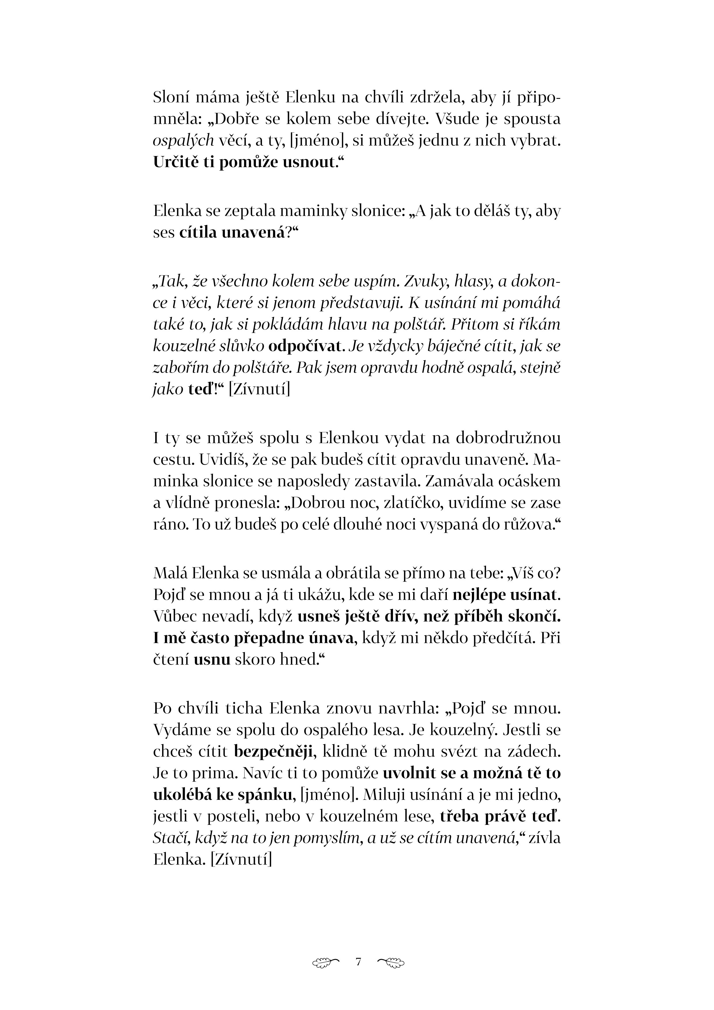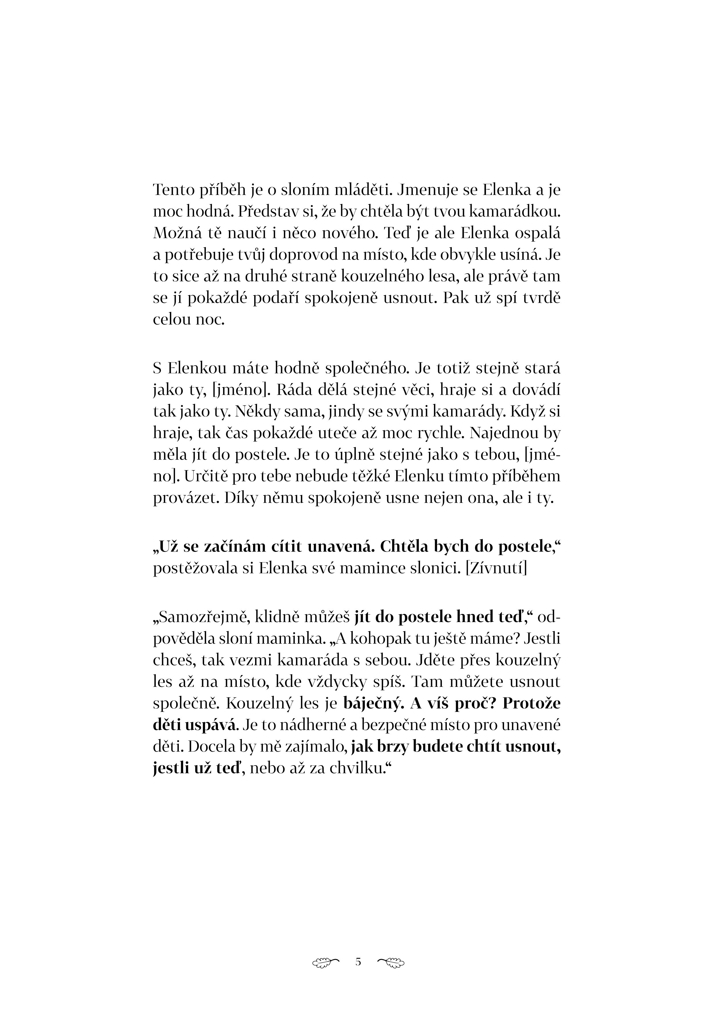 O slůněti, které chtělo usnout je další, s napětím očekávaný příběh, založený na stejné metodě, která děti dokáže zklidnit a uvolnit tak, aby se jim lépe usínalo. Tentokrát se děti seznámí se slůnětem Elenkou, které nemůže usnout. Putuje i s maminkou do kouzelného lesa, kde potkává nové kamarády, krtka Dřímálka, vílu Chrupinku, myšku Popletu i králíčka Káju, od kterého dostane kouzelný uspávací prášek, aby mohla konečně usnout. Cestou se Elenka od přátel učí, jak usínání může být zábavné a příjemné současně. Část knihy je věnována také nejčastějším dotazům rodičů. V této části autor vysvětluje, jak s knihou pracovat, aby metoda byla co nejúčinnější.
