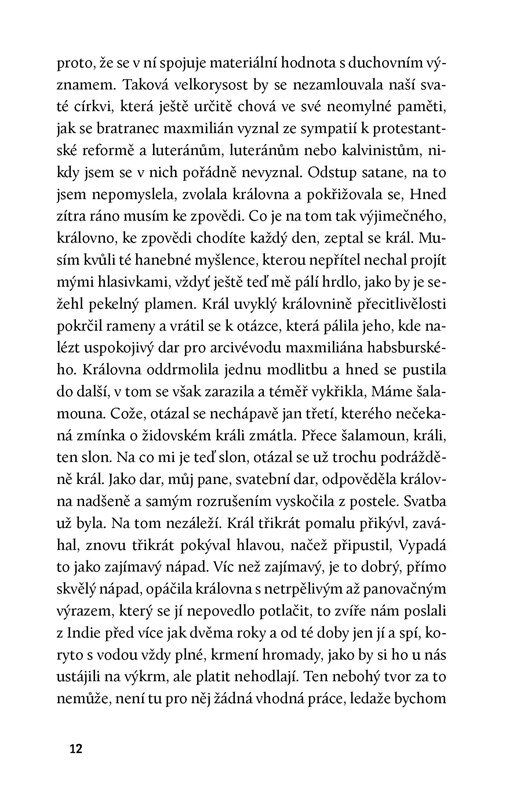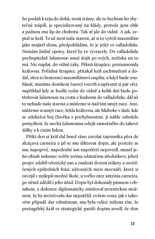 Saramago se pro svůj román o sloním putování inspiroval skutečnou událostí. Zhruba v polovině 16. století se totiž portugalský král Jan III. rozhodl vyslat přes celou Evropu slona indického, který předtím dva roky strádal v zapomenutém koutě jeho lisabonského paláce. Měl se měl stát velkolepým svatebním darem pro jeho švagra, arcivévodu rakouského a mimo jiné i titulárního českého krále Maximiliána II. Habsburského. Příběh slona Šalamouna, který za doprovodu vojenské eskorty pchází přes prašné kastilské pláně až k pobřeží Středozemního moře, aby se po jeho vlnách přeplavil od italského Janova, odkud se přes zasněžené Alpy dostane až do Vídně, je především podobenstvím o lidském bláznovství. Ať už jde o šílené nápady mocných, které někdo musí uskutečnit, nebo o představy prostých lidí, kteří si během cesty do exotického tvora promítají všechno možné. Barvité líčení různých krajů a lidských mravů je zábavné a poučné zároveň.