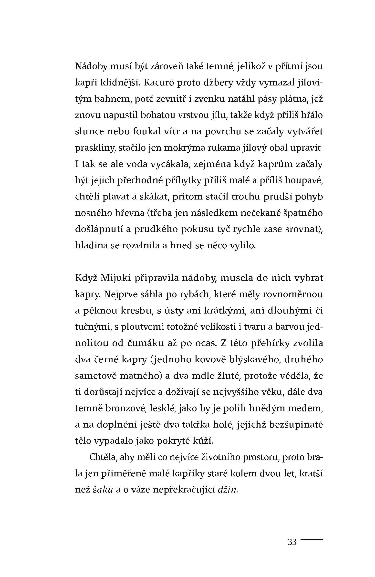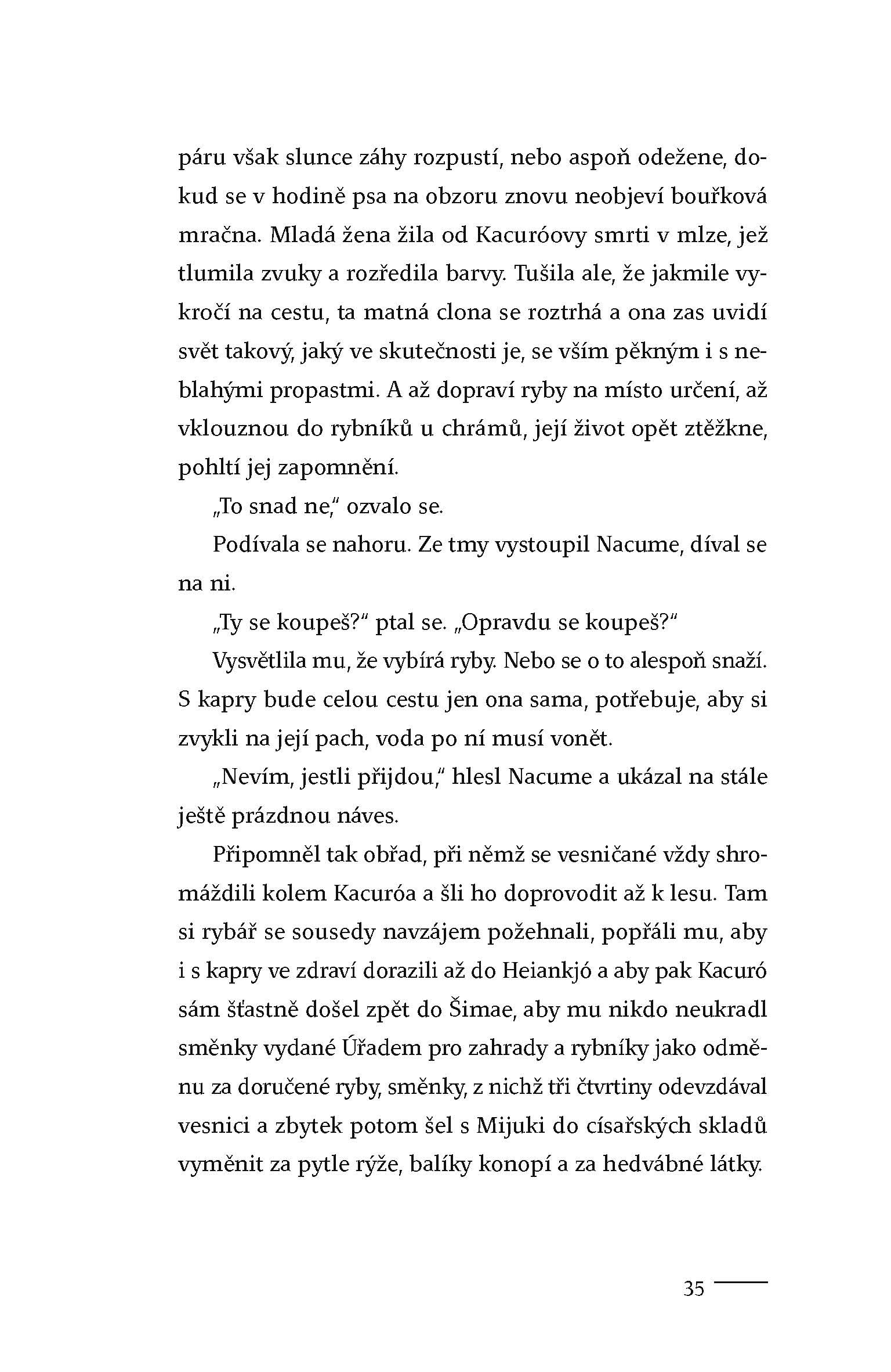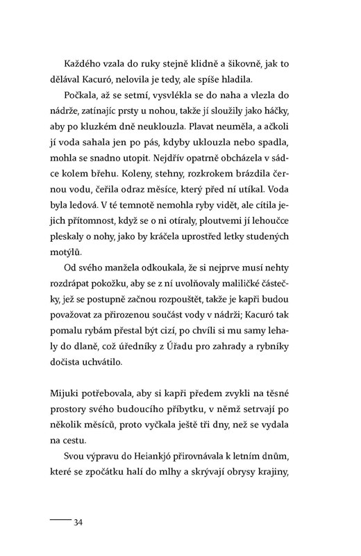 Na březích japonské řeky Kusagawa leží chudá vesnice. Je domovem muže s výjimečným talentem. Rybář Kacuró ovládá umění lovu nesmírně vzácných kaprů, které dodává do dalekého sídelního města. Při jedné výpravě za rybami však Kacuró utone v rozvodněné řece a jediné, co po něm zůstane je poslední úlovek kaprů. Na dalekou a strastiplnou cestu ke dvoru se musí vydat mladá a nezkušená vdova Mijuki. Nikdy dřív nepřekročila hranice vsi a nezná nástrahy světa. V proutěných koších nese těžký náklad ryb a netuší, co ji čeká... Vytříbená kultura i surovost, pohádkový luxus i otřesná chudoba, to jsou dvě tváře Japonska z doby 12. století. Jeden z recenzentů o tomto místy drsném, místy vysoce smyslném románu napsal: „Tenhle román je tvořen řadou literárních zázraků, díky nimž se bahno proměňuje ve zlato.“ Do češtiny jej přeložila Jovanka Šotolová.