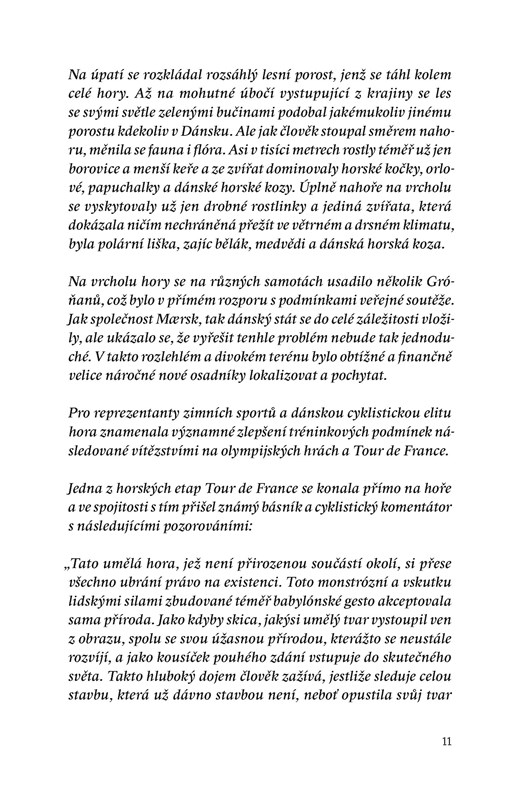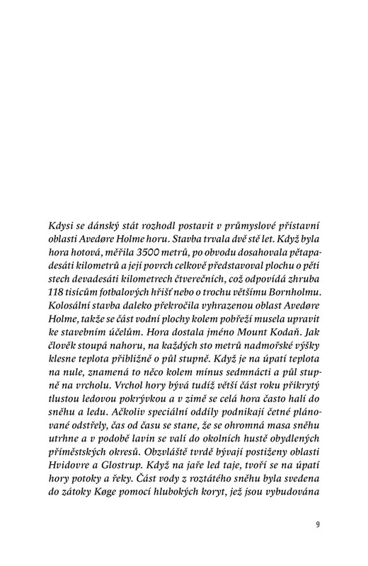 Dánská vláda se rozhodne nad hlavním městem – jedním z nejplacatějších míst světa – vztyčit tří a půltisícovou velehoru. Po obvodu dosahuje přes pětapadesát kilometrů a její povrch odpovídá zhruba 118 000 fotbalových hřišť. Hora nese název Mount Kodaň. Dánsko díky ní získá několik dalších klimatických zón, od tropické až po polární, jež utvoří živnou půdu pro bezpočet nových exotických druhů, které až neuvěřitelně obohatí původní dánskou faunu a flóru.