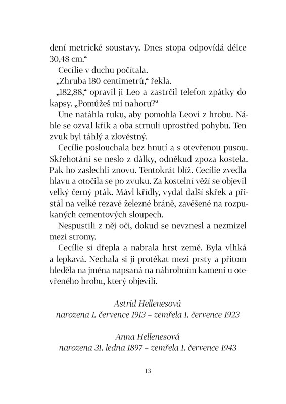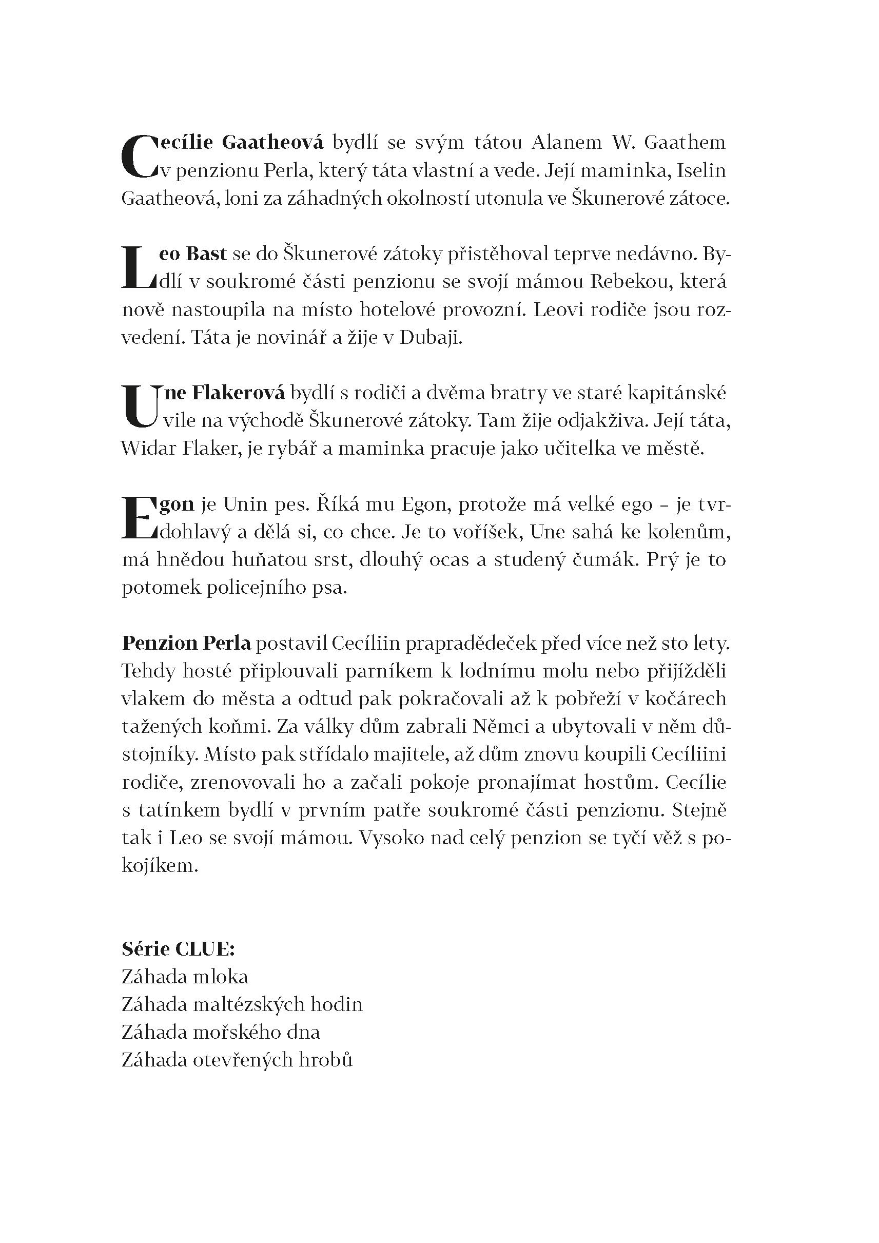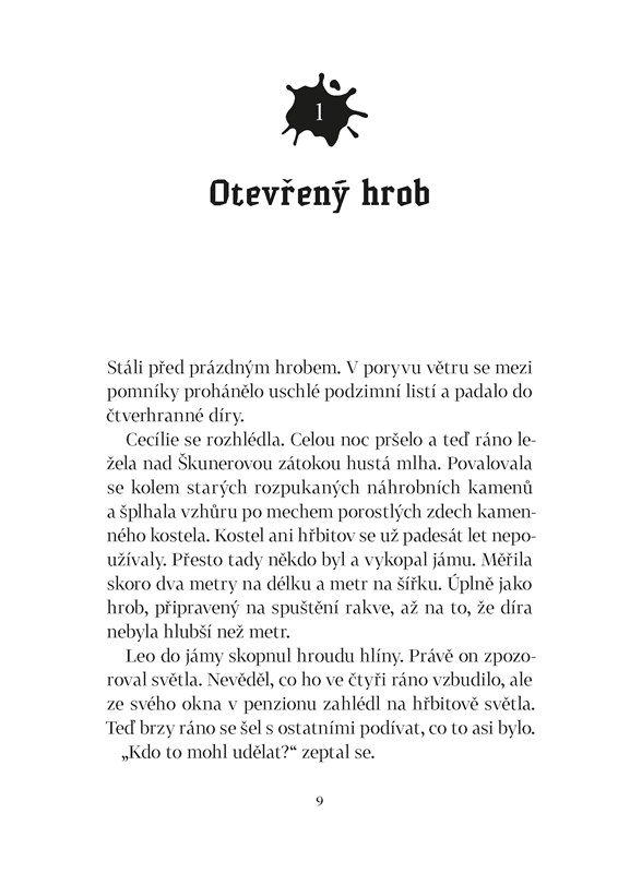 Škunerovou zátoku halí podzimní mlha. A v ní se dějí mrazivé věci. Na starém hřbitově, kde se už dávno nepohřbívá, zahlédne Leo v noci světla. Když se tam kamarádi zajdou podívat, zjistí, že někdo vykopává staré hroby, skoro jako by v nich něco hledal. Ale co? Na své cestě za rozluštěním záhady budou tentokrát Cecílie, Leo a Une muset často překonávat strach. Vždyť na hřbitově se prý zjevuje duch kněze, který před více než sto lety nepomohl posádce ztroskotané lodi. To však není jediný mrazivý příběh starého hřbitova a kostela. I varhaník popravený za války Němci po sobě zanechal tajemství. A možná i poklad. Ale zdá se, že Cecílie, Leo a Une nejsou na stopě ukrytému zlatu sami. Zároveň se kamarádi blíží i odhalení toho, kdo loni v létě zabil Cecíliinu maminku. Po objevení nahrávky z Ptáčníkovy kamery už totiž ani policie nevěří, že by šlo o nešťastnou náhodu...