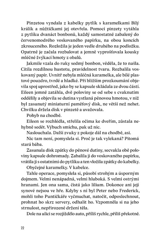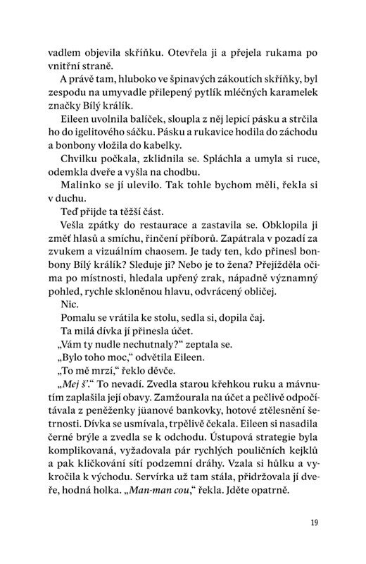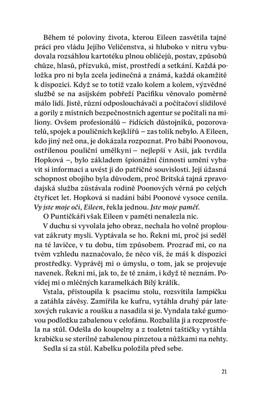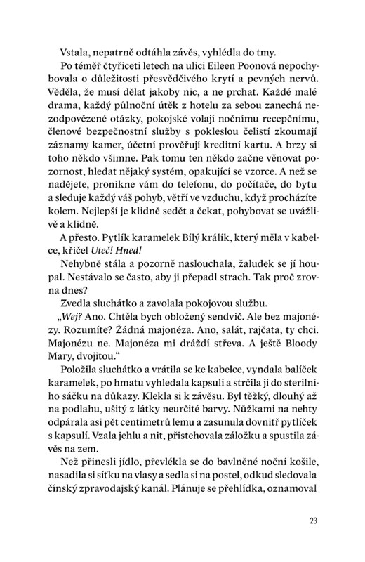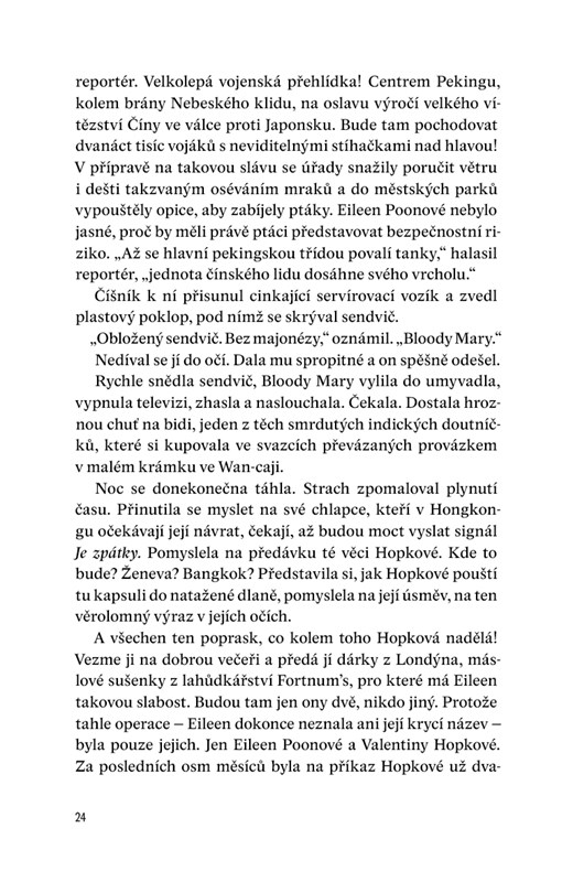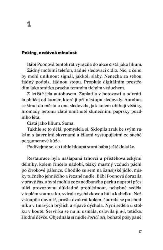 Její jedinou nadějí, jak uniknout neblahému osudu, se stanou dva britští špioni: Trish Pattersonová, potupně odstavená nadřízenými na vedlejší kolej, a Philip Mangan, odhalený a zdiskreditovaný agent, který pomalu, ale jistě sklouzává na scestí. Nalézt pravdu o Pearl Tchaové bude tou nedůležitější a nejnebezpečnější misí, jakou v životě podniknou.