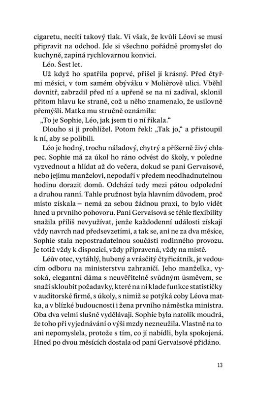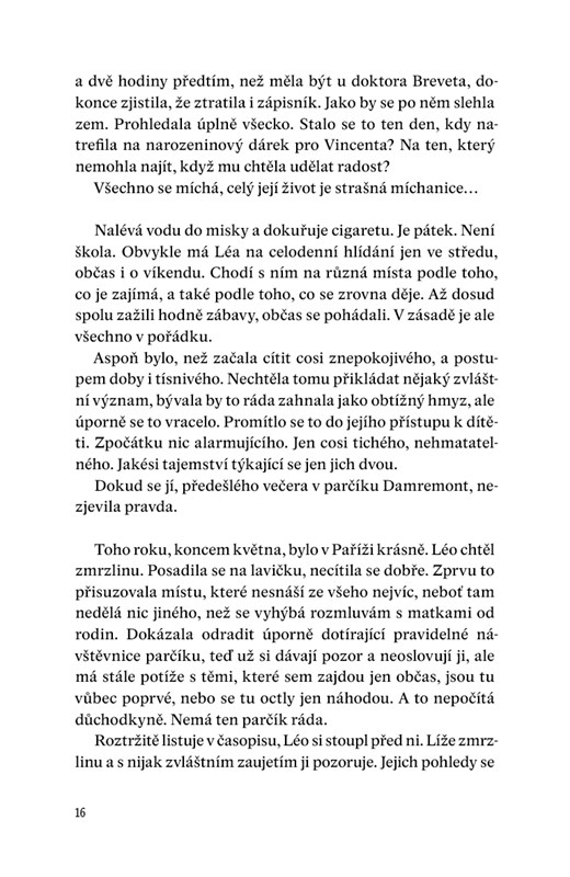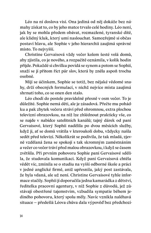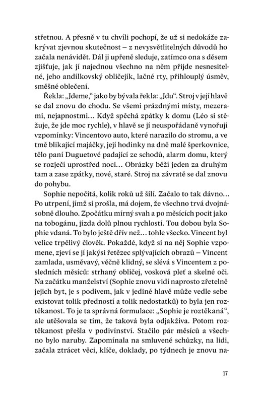 Sophie, celkem obyčejná mladá žena, která na první pohled vede klidný, spořádaný život, pomaličku upadá do šílenství, ztrácí paměť, popadají ji záchvaty nevysvětlitelné zášti a zloby. Kolem ní záhadně umírají blízcí lidé, tchýně a manžel. Potom se postupně probouzí vedle dvou zavražděných těl, ovšem na to, že by vraždila ona, si vůbec nevzpomíná. Daří se jí zoufalý útěk, protlouká se bez dokladů po samém dně společnosti, ale díky neuvěřitelné houževnatosti a odhodlání si dokáže zajistit falešnou identitu i nový život. Bolestné minulosti však přece neuteče… Čtenář se totiž seznámí s tajuplným Frantzem, který zdá se v Sophiině osudu sehrál významnou roli…