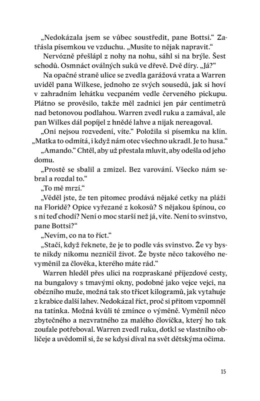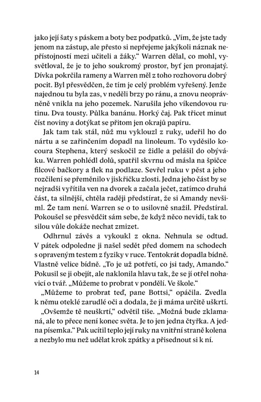 Jednoho nedělního rána si jde Warren zaběhat a po návratu najde Amandu mrtvou, oběšenou na stromě na svém zadním dvorku. Následuje policejní vyšetřování, Warren však nedokáže – nebo nechce – zodpovědět otázky, které se na něj valí ze všech stran. Podezření narůstá a Warrenovi mírumilovní sousedé se brzy začnou chovat nepřátelsky.