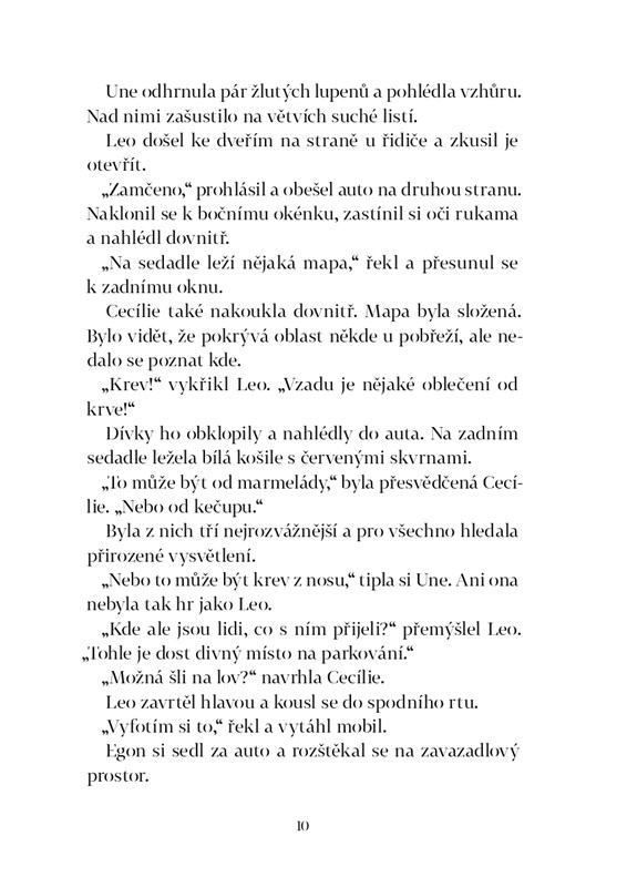 Po vlně chladného podzimního počasí se do Škunerové zátoky vrátily nezvykle teplé a slunečné dny. Pravé babí léto. Cecílie, Leo a Une najdou noviny, ze kterých kdosi vystříhal písmena i celá slova. Vyjde najevo, že v titulcích chybí mimo jiné výrazy jako „miliony“ a „smrt“. Ukáže se, že jde o vyděračský dopis a že policie má zůstat mimo hru. Najít odesílatele bude tudíž úkol pro naše odvážné kamarády. A na to, že se osoba, která slova z novin vystříhala a slepila z nich dopis, nachází ve Škunerové zátoce, ukazuje více stop. Penzion Perla je plný hostů, kteří sem přijeli na podzimní prázdniny, jedni zajímavější než druzí a mnozí z nich mají co skrývat. U Kamenitého ostrůvku kotví záhadná plachetnice a v lese parkuje zaprášené auto se zakrvácenými hadry na zadním sedadle.