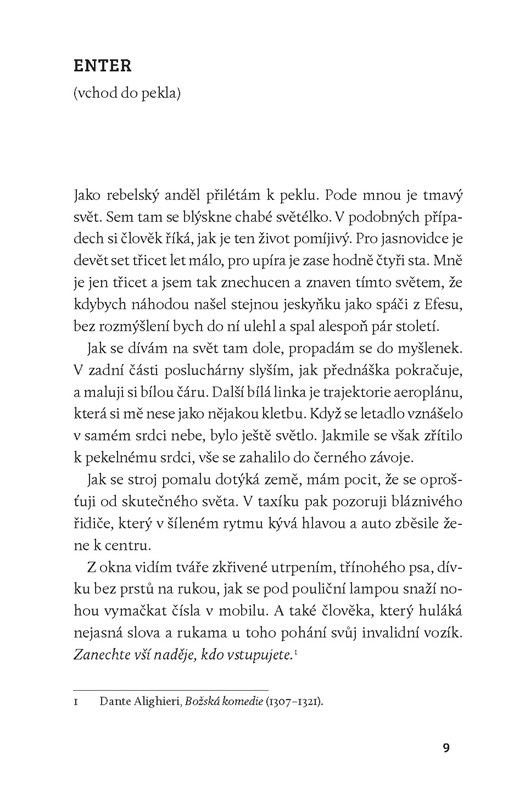 Vlk samotář – tak trochu zatracenec, tak trochu punker – na symbolické pouti dantovským peklem, při níž odvážným způsobem poodkrývá, co se mu honí hlavou. Autorovo alter ego tak naráží na otázky sociální a politické bezmoci současného Balkánu, na problém rozkladu vzdělávacího systému, rostoucího náboženského extremismu či historické mytizace. Paralelně a velmi otevřeně, až Bukowského stylem, líčí také milostné a sexuální vztahy a různé stupně jejich marnosti. Dílo je protkáno všudypřítomnou melancholií a vztekem doprovázeným notnou dávkou humoru s odkazy – často „akademicky“ vysvětlenými jako poznámky pod čarou – na současnou pop music, malířství, film a divadlo. Autorův stylistický rejstřík je neuvěřitelně široký: od nejhrubšího kosovského dialektu po slovník univerzitního pedagoga.