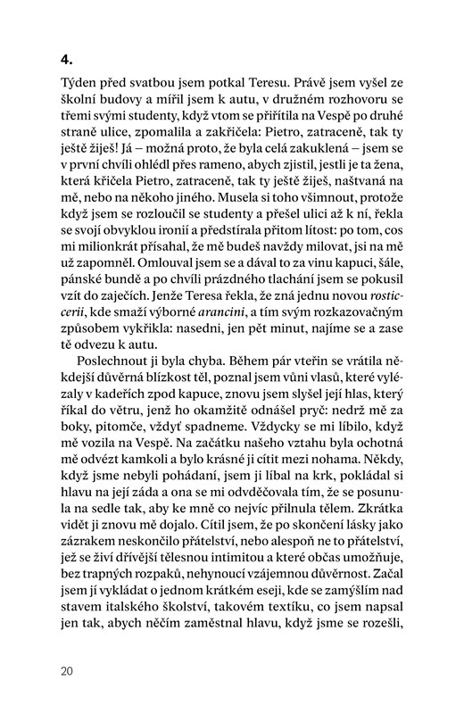 „Být panem Hydem je snadné, stát se doktorem Jekyllem ne.“ K tomuto poznání dospěje Pietro Vella, středoškolský profesor a později celkem úspěšný literát, který je celý život vázán důvěrným poutem ke své bývalé studentce Terese, s níž v mládí prožil tři roky vášnivého a výbušného vztahu. Jejich pouto je založeno na kompromitující informaci, kterou si vzájemně svěřili. Vzniklá důvěrnost je jejich tmelem, ale i zbraní, kterou jeden druhého drží v šachu. Co tak strašného provedli? Je lepší lásku živit milosrdnou lží, nebo nelítostnou pravdou? Podobá se láska lávě z vybuchlé sopky, nebo spíš stojaté vodě v bezpečném přístavu? Zná nás lépe ten, s kým jsme prožili celý život, nebo ten, s kým nás pojí intenzivní pocit důvěrnosti? Jsme tím, za koho se považujeme, nebo tím, koho v nás vidí druzí? To jsou jen některé z otázek, které klade Domenico Starnone ve svém posledním románu Důvěrnosti, jež je spolu s Tkaničkami, vydanými Knihou Zlín v roce 2019, součástí jeho přesvědčivé „Citové trilogie“. Čtenáři se opět můžou nechat vést sugestivním vyprávěním o složitém propletenci životů blízkých osob, které k sobě někdy mají nepředstavitelně daleko, a zejména o tom, že pokud se nedopustíme přestupku jen proto, že k tomu nemáme odvahu, neznamená to, že jsme dobří.