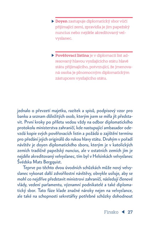 Dana Huňátová působila v letech 1992–2014 jako velvyslankyně ve Finsku, Egyptě a Malajsii a jako generální konzulka v Chicagu. Ve své knize provádí čtenáře po zajímavých místech Evropy, Afriky, Asie i Severní Ameriky a nechává je nahlédnout do „tajů“ každodenní práce diplomata. Popisuje zkušenosti s prací v zahraničí, která ve své rozmanitosti zahrnuje úmornou byrokracii, společenské akce i adrenalinové příhody. Nejvíce si ale autorka cení toho, že jí tato práce umožnila setkávat se s výjimečnými lidmi všech světadílů.