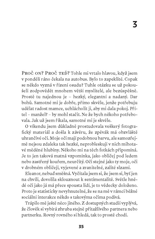 Eleanor, hlavní postava a vypravěčka románu, není hrdinkou v pravém slova smyslu. Její neschopnost navázat kontakt s ostatními lidmi a dodržovat sociální konvence či běžné společenské rituály z ní činí napůl komickou, napůl tragickou postavu. Autorce se daří s pozoruhodnou věrností vystihnout vnitřní svět bytostného introverta a misantropa, který se vnímáním okolního světa diametrálně odlišuje od „normálních“ lidí.