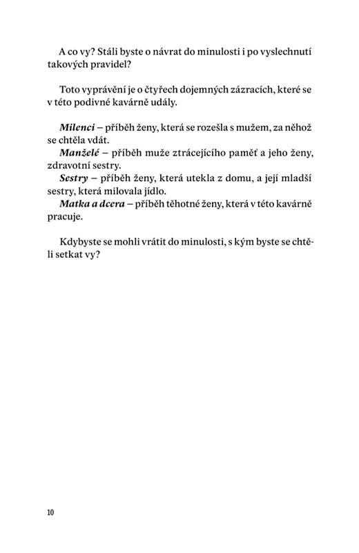 Přesto se najdou lidé, kteří, když se o této možnosti doslechnou, se rozhodnou ji využít. Kniha nabízí čtyři příběhy osob, které se o cestu v čase pokusily, a jejich dojemná rozuzlení: