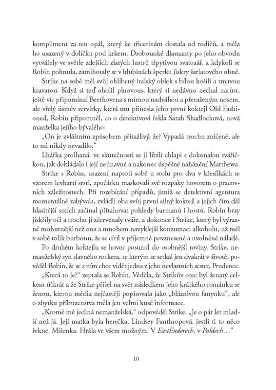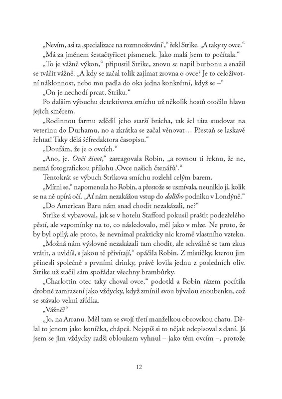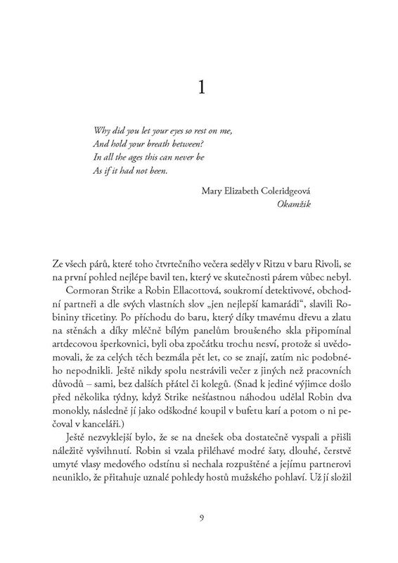 "Anomie. Stav, ve kterém přestávají platit pravidla a vytrácí se veškerá morálka. V dlouho očekávané novince Roberta Galbraitha alias J. K. Rowlingové je to nejen leitmotiv vyprávění, ale také přezdívka klíčové postavy. Dvojici detektivů kniha zavádí na okraj společnosti, do hned několika líhní nenávisti. Dlouho je tam nechává zmatené, napjaté a nakonec trochu zaskočené. Stejně jako čtenáře."