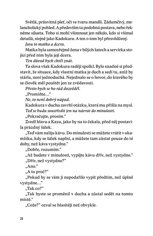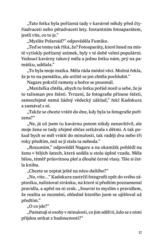 Čtvrtý díl série o podivné kavárně, v níž je možné se vrátit do minulosti, bude možná pro mnohé čtenáře překvapením. V předchozím dílu, Než vzpomínky vyblednou, se děj přesunul do kavárny Dona dona ve městě Hakodate na ostrově Hokkaidó. Nyní se nejen vrací zpět do tokijské kavárny Funiculi funicula, ale vrací se i v čase, do období mezi dějem prvního a druhého dílu. I tentokrát, jak už jsme si zvykli, se můžeme těšit na čtyři emočně silné příběhy. Všichni hrdinové nejprve pocítí zklamání, jakmile zjistí, že i když se vrátí zpět do minulosti, realitu změnit nedokážou a svého blízkého od smrti neuchrání. Přesto jim toto setkání pomůže se se smutnou situací vyrovnat a odpustit si. Hlavní postavou prvního příběhu je starší muž, který kvůli zájmu o archeologii zanedbává vlastní rodinu, a teprve když o svou ženu přijde, uvědomí si, co pro něho znamená. Druhý příběh vypráví o vyrovnávání se se ztrátou milovaného psa, o něhož se jeho majitelé starali jako o vlastní dítě, které mít nemohli. Ve třetím příběhu si mladá žena teprve po smrti přítele uvědomí, že on byl ten pravý. Poslední příběh a složitém vztahu dcery a otce je připomínkou Velkého východojaponského zemětřesení, které Japonsko zasáhlo v roce 2011.
