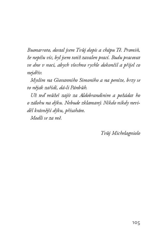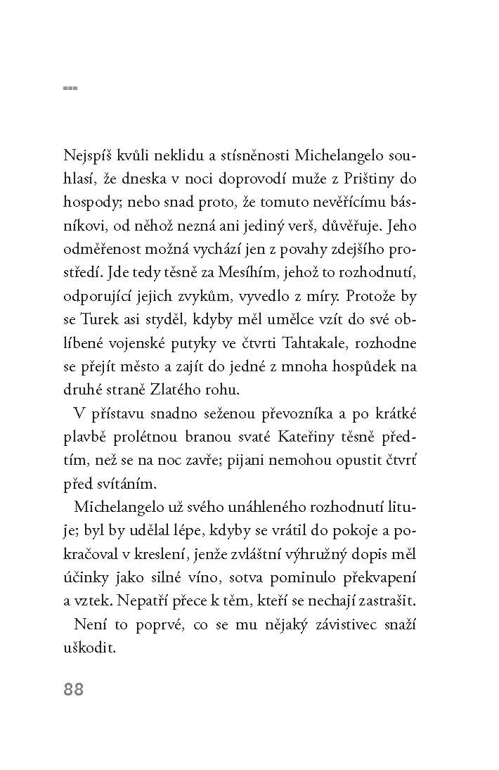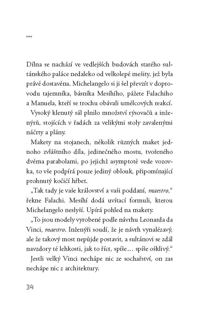 Děj: 13. května 1506 dorazil Michelangelo Buonarroti do Cařihradu. Opustil Řím, kde pracoval na hrobce papeže Julia II. a kývl na nabídku tureckého sultána, který mu chce svěřit stavbu mostu přes Zlatý roh, na němž předtím pracoval Leonardo da Vinci. Na tomto pozadí se odehrává fascinující setkání velkého renesančního umělce s Východem, nahlédnutí do podivuhodného a nebezpečného byzantského světa. Enard píše tak, jak Michelangelo maluje: někdy je smyslný jako šerosvit malby, někdy ostrý jako břitva. Mathias Enard patří k hvězdám současné francouzské literatury. V roce 2008 dostal Prosincovou cenu a cenu Inter, za tento román dostal Prix Goncourt des Lycéens 2010 (Goncourtovu cenu udělovaná středoškoláky).
