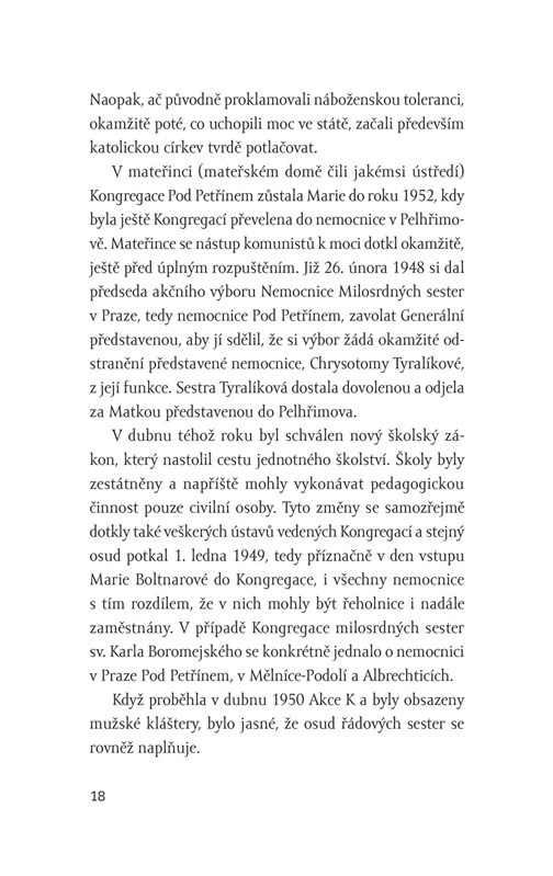 Opravdové životní příběhy českých řeholnic a řeholníků ve víru bouřlivého 20. století jsou mnohdy napínavější než fiktivní thrillery. Kdo byly ony ženy, na jejichž úděl upozornila nedávno autorka bestsellerového románu Bílá voda? Jaký byl osud oněch nenápadných mužů zasažených komunistickými restrikcemi, které nastartovala obludná Akce K? Přehledná publikace doplněná základní faktografií poutavě přibližuje některé osudy řádových sester a bratrů napříč církevními řády a kongregacemi.