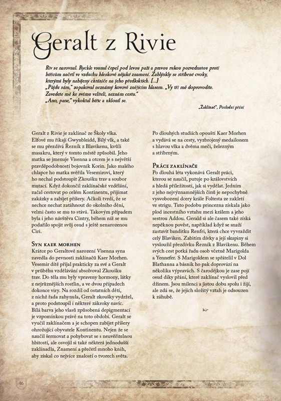 Legendární zaklínač Geralt během svých dobrodružství navštívil řadu míst: království Cintru, les dryád Brokilon či pohádkové knížectví Touissant. Na cestách potkal mnoho barvitých postav i krvelačných tvorů. Poznejte je všechny! V této ilustrované publikaci procestujete bájný svět Andrzeje Sapkowského, poznáte osudy Geraltových přátel i soupeřů a seznámíte se s monstry jako bazilišek, kikimora nebo striga. Opásejte se zaklínačskými meči a vyrazte objevovat jednu z nejslavnějších fantasy ság všech dob.