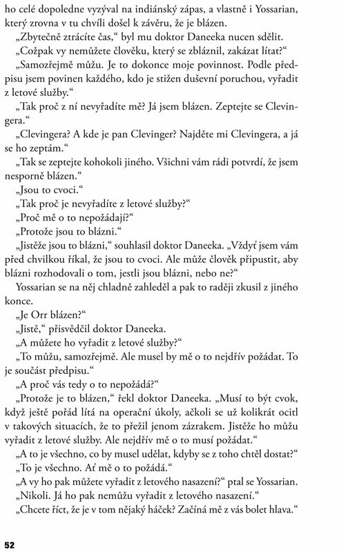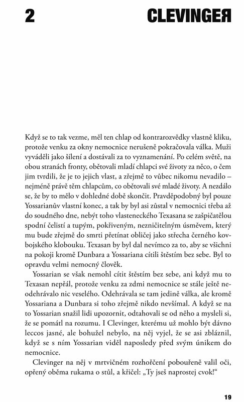 „Hlava XXII. ta mi zamotala hlavu.“ Ve své nejslavnější knize Joseph Heller na základě vlastních zkušeností s armádou píše o světě, v němž je vše postavené na hlavu; a protože absurdita je věčná, zamotal tento skvělý protiválečný román hlavu už několika generacím čtenářů. Odehrává se za druhé světové války a v sérii absurdních epizod vyprávěných z hlediska několika různých postav satiricky napadá krutost, nesmyslnost válečné mašinerie.