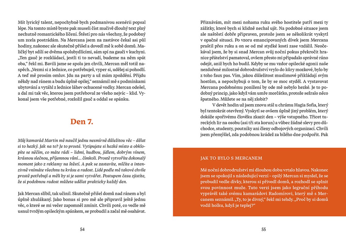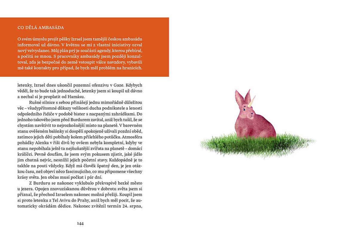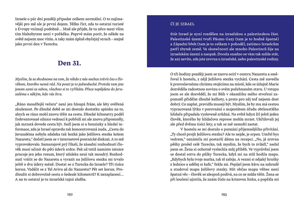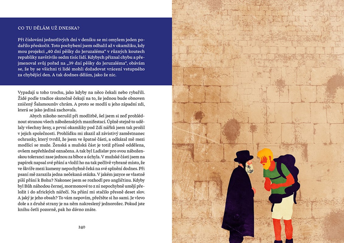 Jeho kniha je pozoruhodnou kombinací nadsázky a vtipu, které střídají častá zamyšlení nad vážnými tématy. Hlavním motivem je zde autorova pouť do Jeruzaléma, na kterou se vydal loni v létě. Bez mapy a orientačního smyslu se mu podařilo ujít 1400 kilometrů napříč rozpálenou krajinou Turecka a Izraele, stanout pod Zdí nářků a prožít nezapomenutelné dobrodružství.