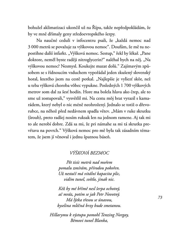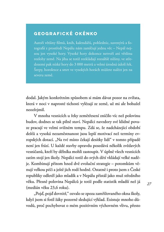 Když mi byly tři, rozbil jsem si hlavu o bidet. Když mi bylo devět, rozbil jsem si hlavu o kolo, které jsem vedl do kopce. Myslím, že bych vůbec neměl cestovat, protože jsem hrozně nešikovnej. Ale stejně to dělám. Radši ale chodím pěšky, protože tak je to nejbezpečnější. Jednoduše vyrazím na cestu a čekám, co mě tam potká. Tentokrát jsem se vydal do Číny a Nepálu. V kraťasech ze supermarketu a brýlích z drogerie jsem prošel Himálaj i úplně neznámé vesnice v údolích řek. Mnohokrát jsem spal u úplně cizích lidí doma a poznával, jak se jim doopravdy žije a co jim přináší štěstí. Už na cestě jsem o nich začal psát tuto knihu. Času na psaní byl dostatek, protože ujít pěšky 1 500 kilometrů trvá docela dlouho. Jak si teď po sobě knihu čtu, myslím, že se mi povedlo vytvořit pěkné svědectví o jednoduchosti života a půvabu svobody. Jestli se chcete dozvědět něco o památkách a historii, radši si ji ale nekupujte. Kniha je jen o Číňanech, Nepálcích a jejich životě. A taky trochu o mně. Tomu se člověk nevyhne, když jde sám.