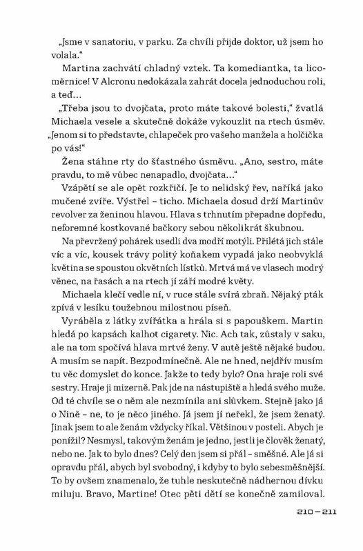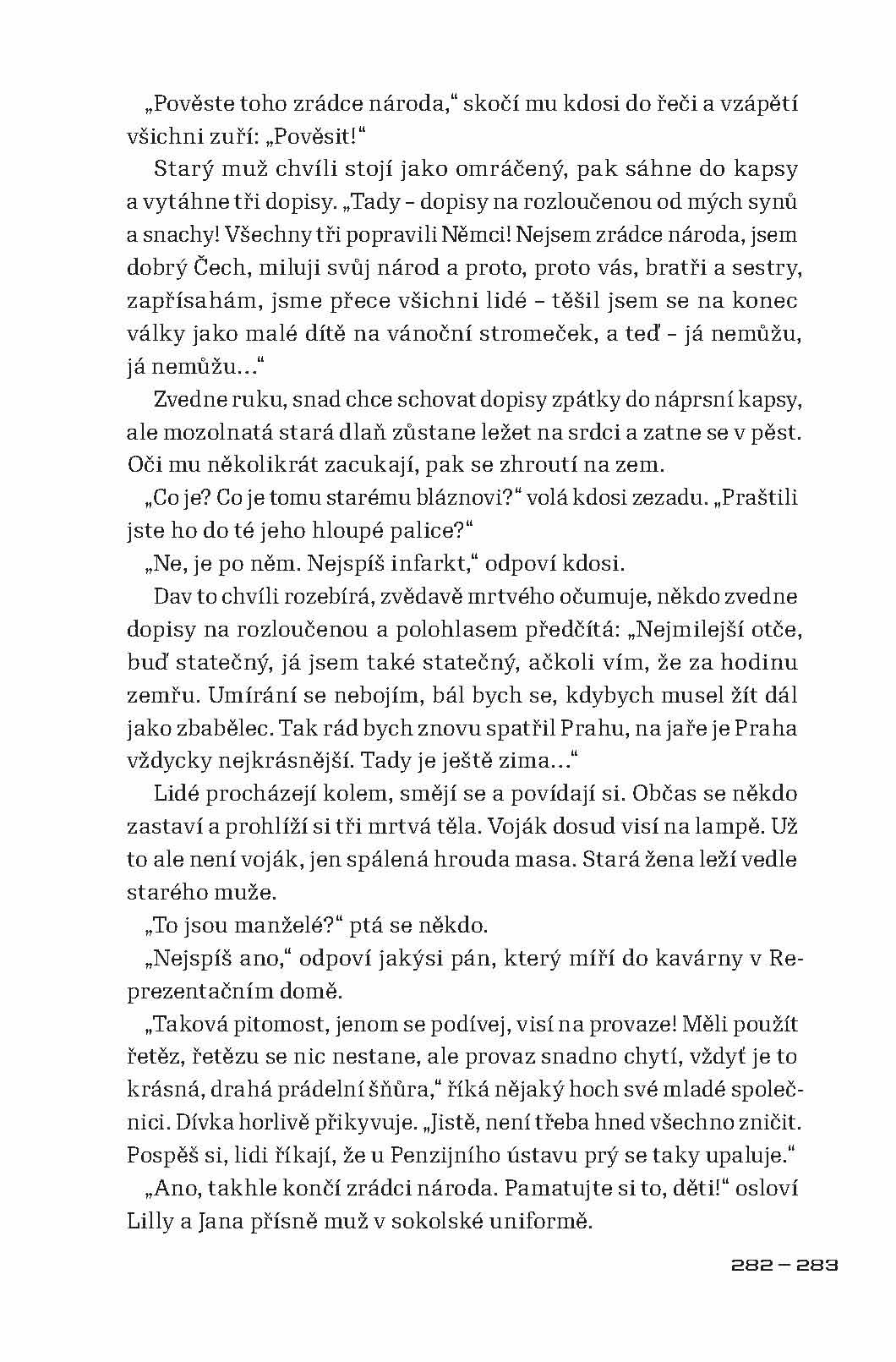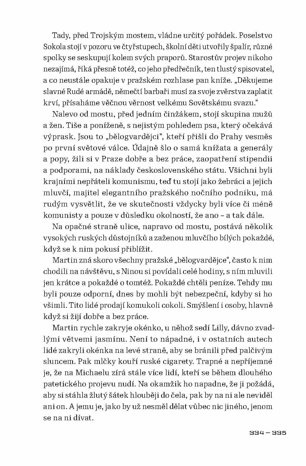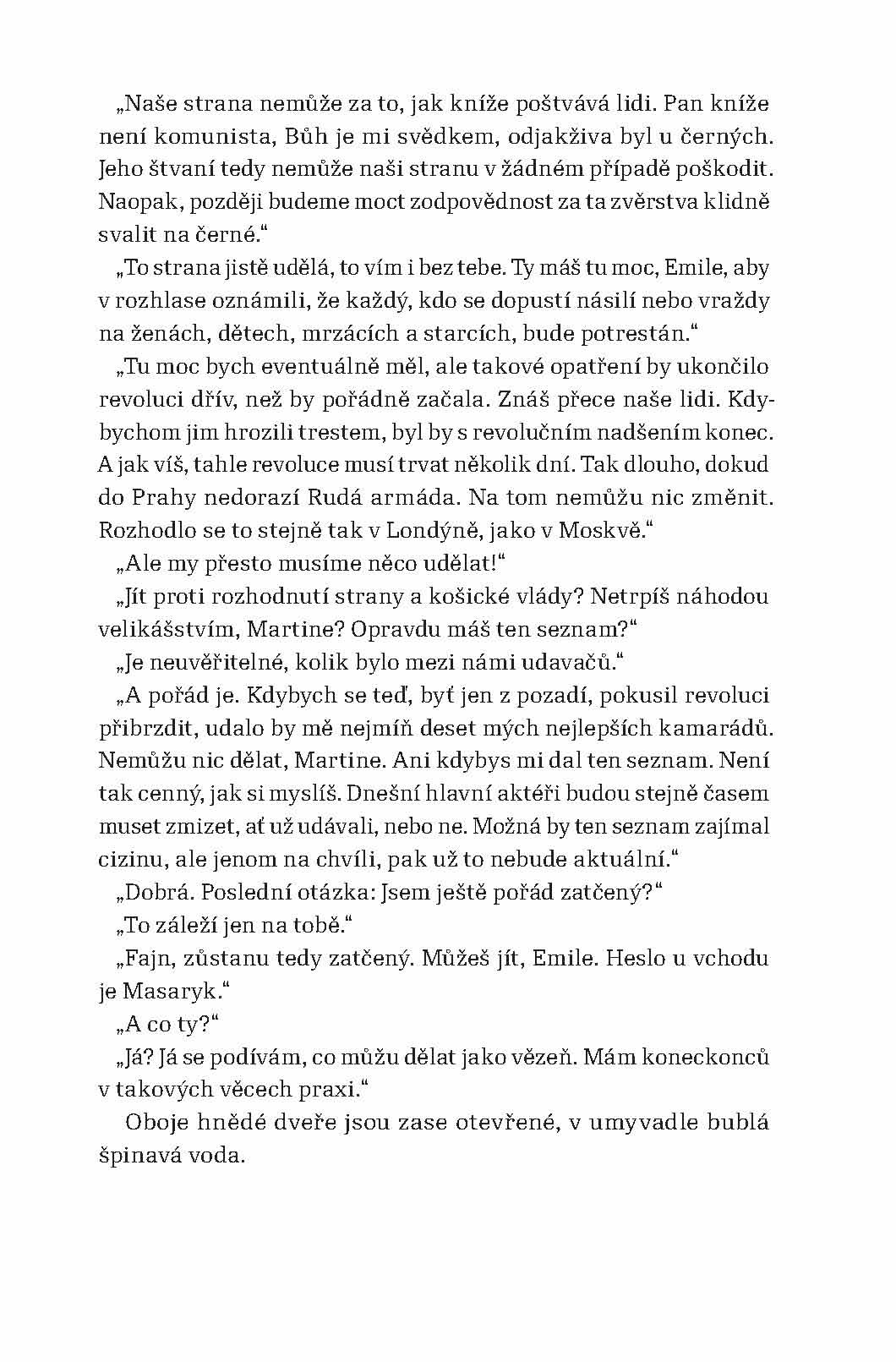 Román autorky, o jejíchž životních osudech se skoro nic neví, vypráví o dnech Pražského povstání v květnu roku 1945. Autorčin pohled, založený na osobních vzpomínkách, je mírně řečeno velice neobvyklý. Popisují se v ní krutosti páchané Revolučními gardami nejen na německém civilním obyvatelstvu, ale i na Češích, kteří jen v nejmenším nesouhlasili s tím, co gardisté provádějí, a proti jejich řádění se postavili. Hlavním viníkem těchto hrůz byl podle autorky Pražský rozhlas, který svým bezdůvodným štvaním způsobil, že v těch několika dnech přišly o život desítky tisíc lidí. Památný boj o rozhlas byl podle ní jen zinscenovanou provokací, jež měla vyvolat vražedné běsnění a rabování. Květnové povstání bylo v jejích očích motivované pouze mstou, potřebou kolaborantů zamést za sebou stopy a ambicemi těch, kteří v konci války spatřovali možnost, jak se dostat k moci a bohatství.